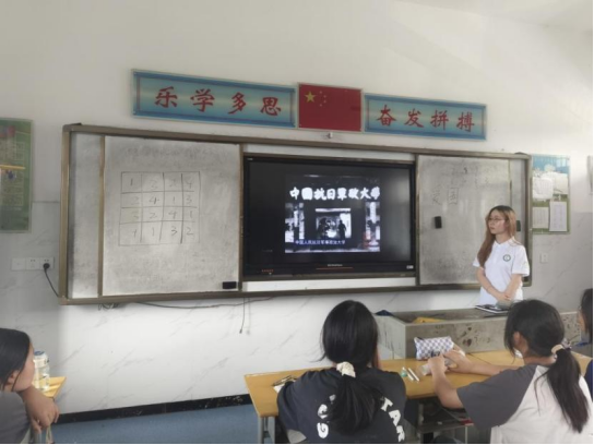 志愿服务队以传播抗大精神,弘扬红色文化,将爱国和爱党的情感深深植根于员工心中为宗旨,结合孝感市孝昌县当地的抗大分校红色文化,专门开设了中国抗日军政大学红色文化课。7月5日下午,志愿者周芙莹同学以观看视频和红色故事讲解的形式为小悟林中801班的同学介绍了中国抗日军政大学的起源与发展,介绍了抗大精神的内涵,提醒同学们要时刻保持危机意识,始终将爱国放在第一位,最后志愿者与员工共同学习中国抗日军政大学的校歌,并决定将这首充满红色文化气息和爱国主义精神的歌曲作为班歌。